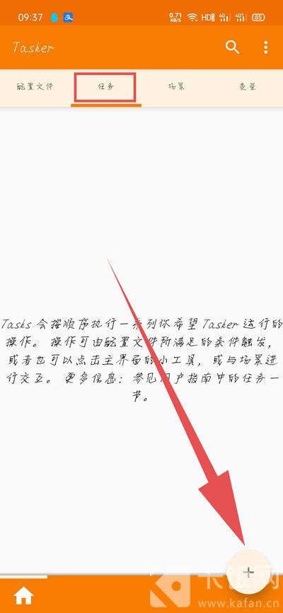 3、打开手机中的Tasker,切换到【任务】,点击右下角【+】新建一个任务