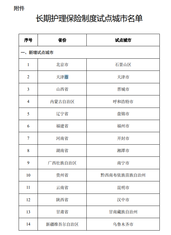 北京、天津、山西、内蒙古自治区、辽宁、福建、河南、湖南、广西、贵州、云南、陕西、甘肃、新疆维吾尔自治区等14个省区市相关市区纳入长期护理保险制度试点。加上原来的河北、吉林、黑龙江、上海、江苏、浙江、安徽、江西、山东、湖北、广东、重庆、四川和新疆生产建设兵团,目前,长期护理保险试点省区市已达28个。