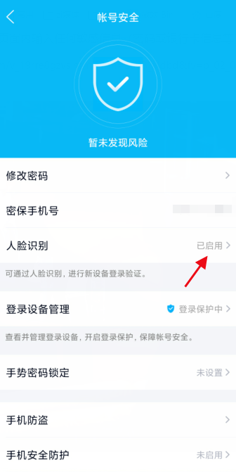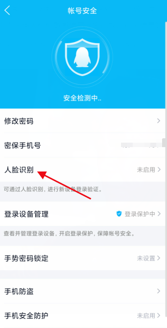 进入设置界面,点击【账号安全】,如图,选择【人脸识别】功能,