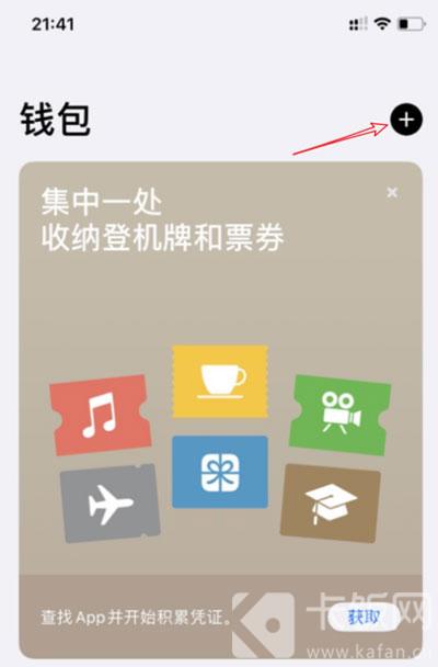 1、打开IPhone手机中的【钱包】app,在右上角点击【+】按钮;