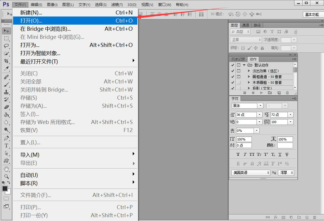 1、首先,我们完成Cutterman的安装,重启PS,点击“文件”菜单中的“打开”。