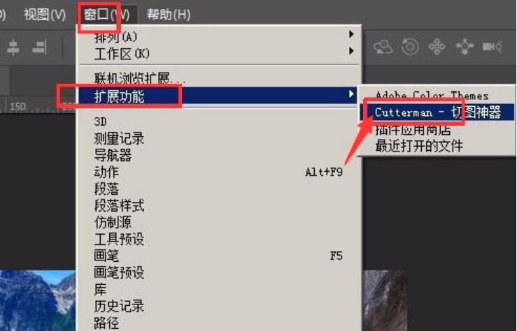 3、然后,点击PS“窗口”菜单中的“扩展功能”,并从中点击“Cutterman-切图神器”。