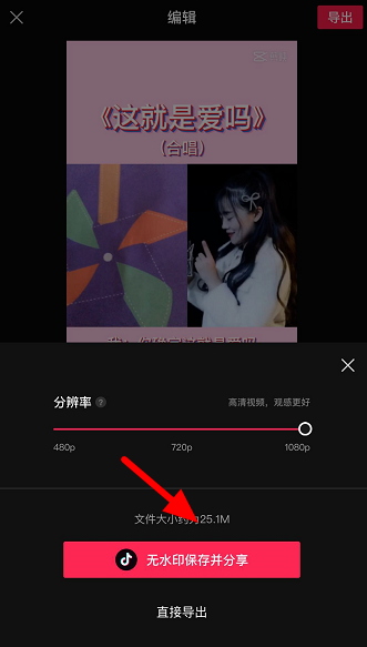 如图,选择分辨率,点击【无水印保存并分享】,分享到抖音即可。