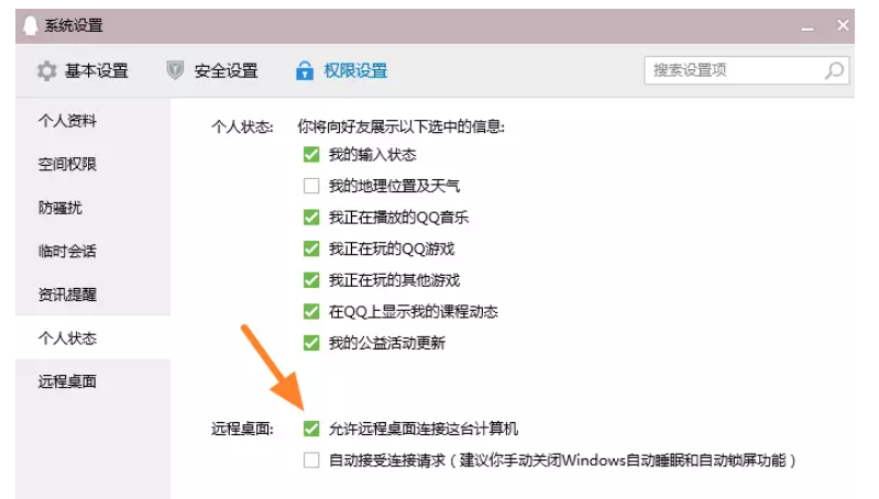 在侧边栏点击【个人状态】,选择【远程桌面】,勾选【允许远程桌面连接这台计算机】即可。