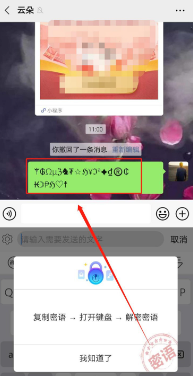 如图,文字发送成功,即会自动转译为密语消息,别人看到的就是一串符号或者代码,对方只要进行“解码”,就能看到真正的文字内容。
