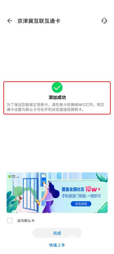 4、支付充值金额之后,提示【添加成功】表示添加交通卡成功;