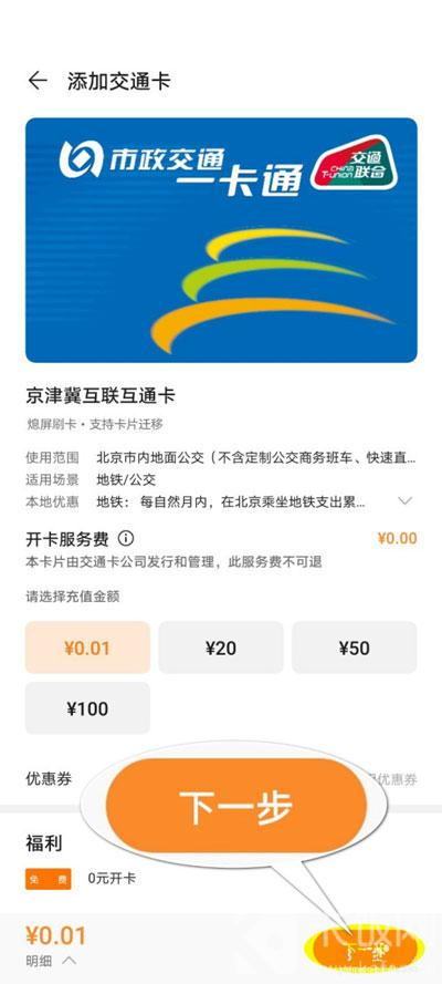 3、然后在添加公交卡页面,选择需要充值的金额,点击【下一步】,注意需要添加的交通卡,部分需要收取开卡服务费;