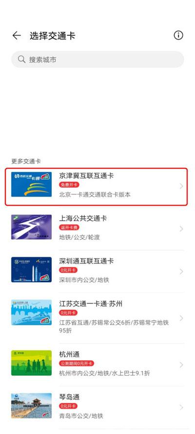 2、随后在选择交通卡页面,搜索或者选择需要开卡的类型;