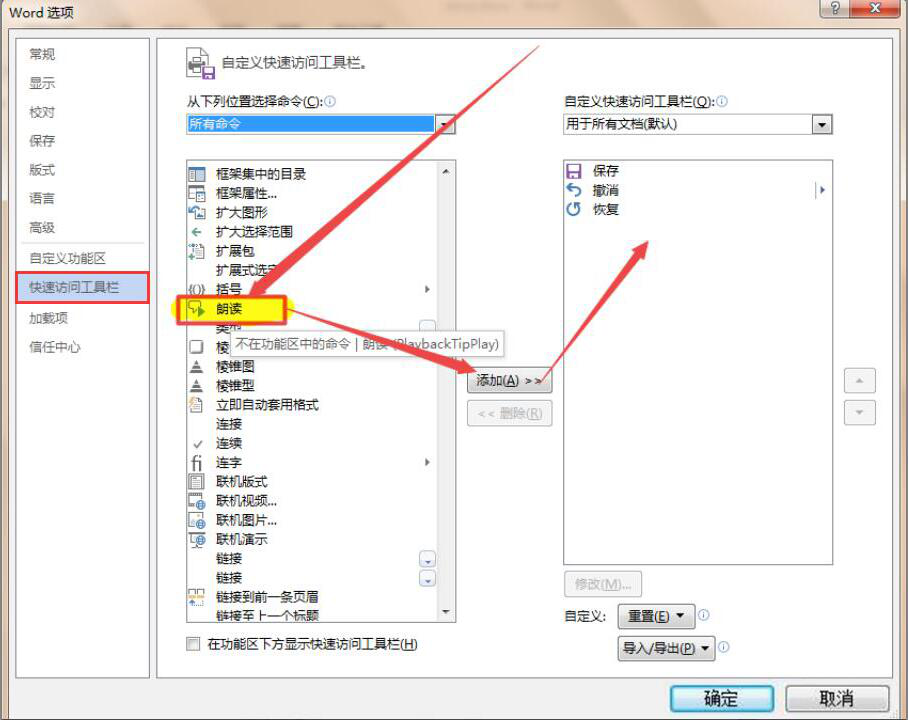 3、接下来,在word选项窗口中,我们点击左侧“快速访问工具栏”,并在其右侧界面的命令中,找到“朗读”工具,我们单击选中它并单击“添加”按钮。