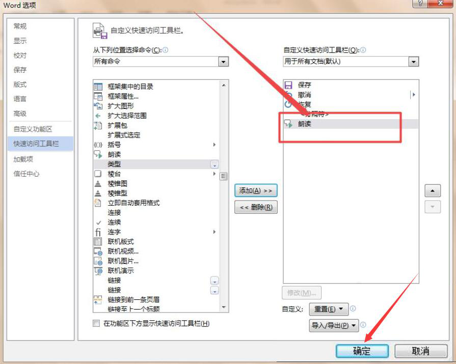 4、word朗读工具便被添加至自定义快速访问工具栏的列表,如下图,我们再点击“确定”按钮。