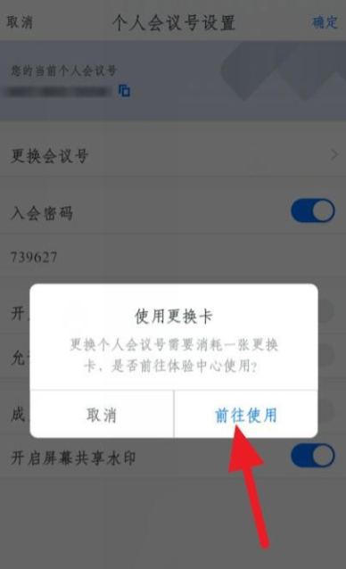 4、出现提示,点击【前往使用】,进入卡券页面,点击【专属个人会议号更换卡】,即可使用更换卡,