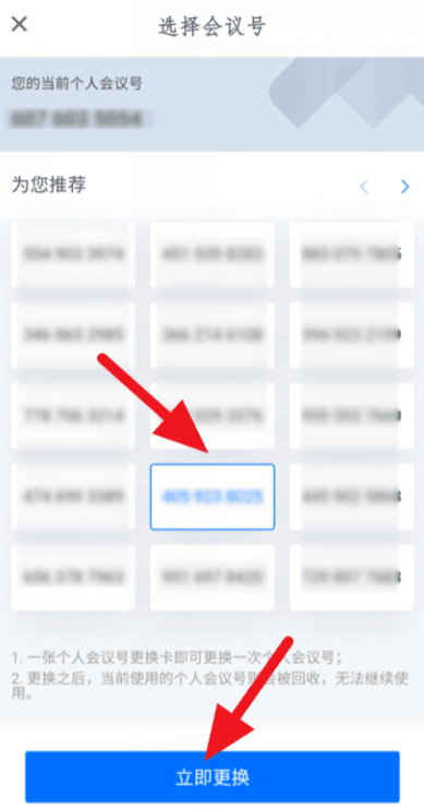 5、进入选择会议号页面,选择新的会议号,最后点击【立即更换】。