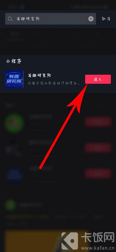 2、在搜索框中输入【有趣研究所】,点击搜索结果中的小程序进入;