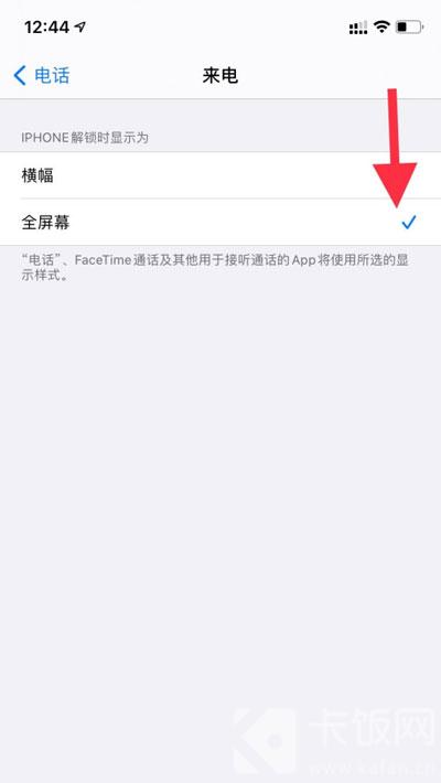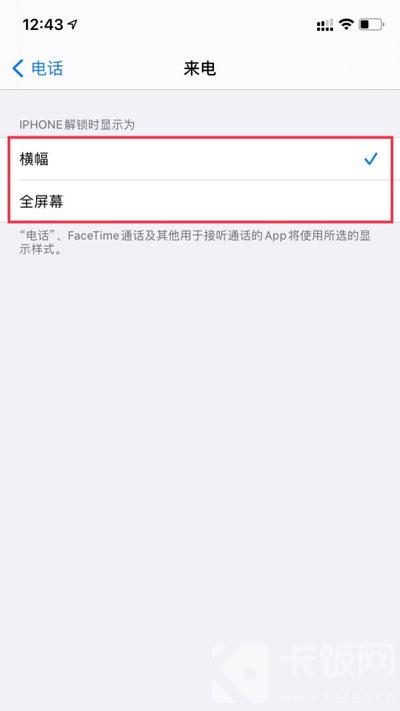 3、此时可以看到,IPhone解锁后来电是以横幅显示,选择【全屏幕】;