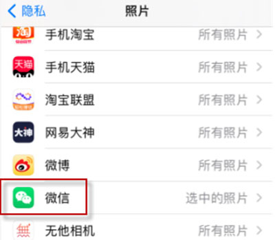 4、在照片隐私设置页面,下滑一直找到【微信】;