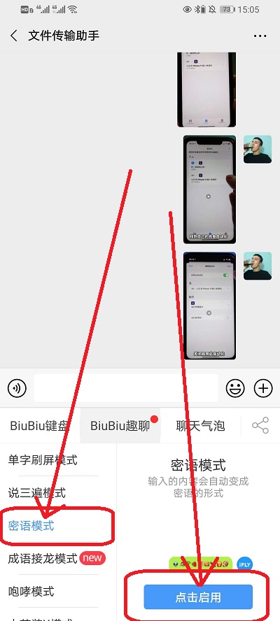 3、在BiuBiu神器的界面中下拉找到密语模式,点即进入谜语模式,然后再点击右边的点击启用按钮,即可开启密语模式。