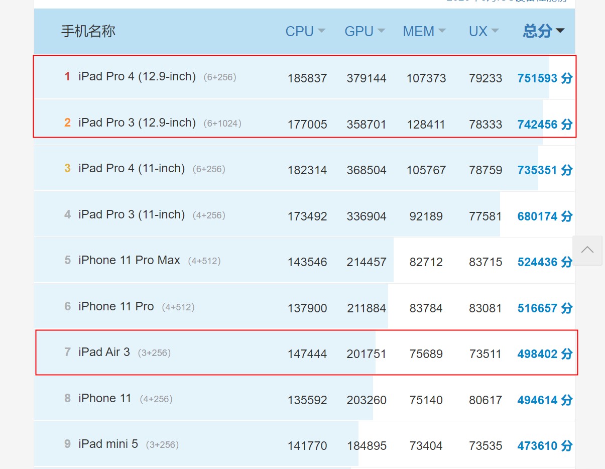 2、根据安兔兔官网的跑分数据,搭载 A12 处理器的 iPad Air 3 跑分数据如下: