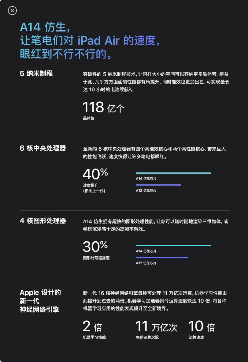 1、和往常在 iPhone 首发不同,苹果选择在 iPad Air 4 上配备全新 5nm 工艺的 A14 仿生芯片。据官网和发布会介绍,A14 搭载了六核