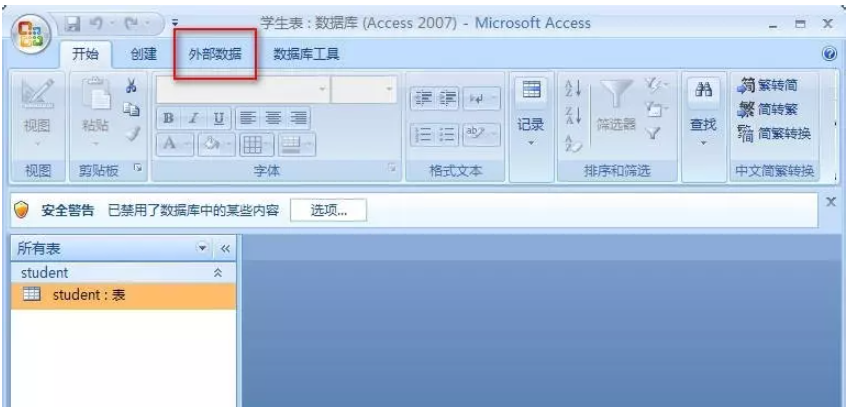 首先打开Access数据库文件,进入主界面,如图,在上方菜单栏点击【外部数据】选项,