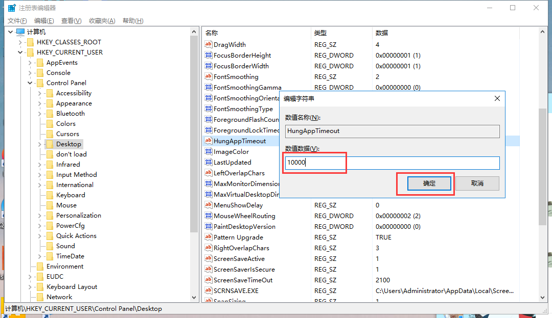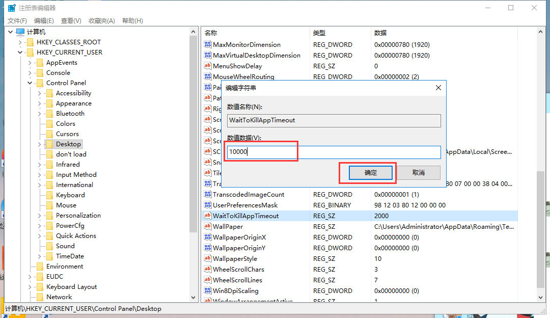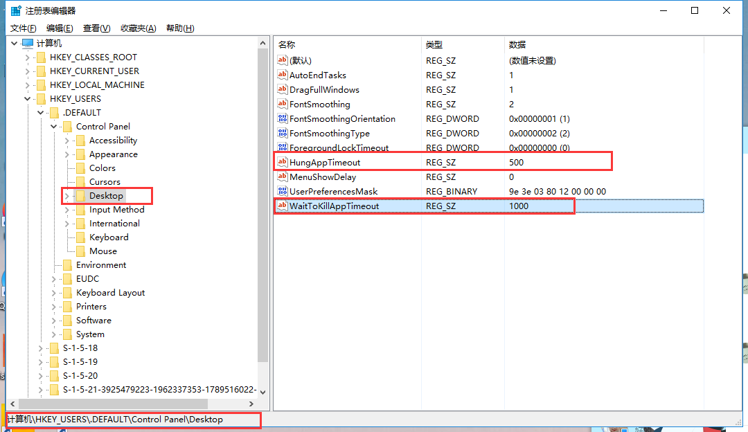 7、同样定位到【HKEY_USERS/.DEFAULT/Control Panel/Desktop】,将【WaitToKillAppTimeOut】和【HungAppTimeOut】数值改为10000,方法同上。