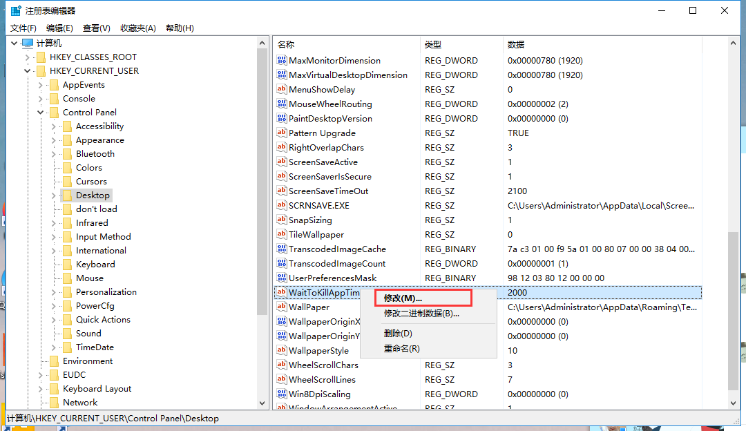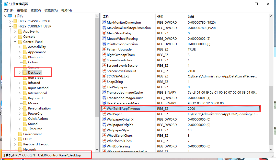 2、打开注册表编辑器,展开定位【HKEY_CURRENT_USER/Control Panel/Desktop】,选择右侧的【WaitToKillAppTimeOut】,