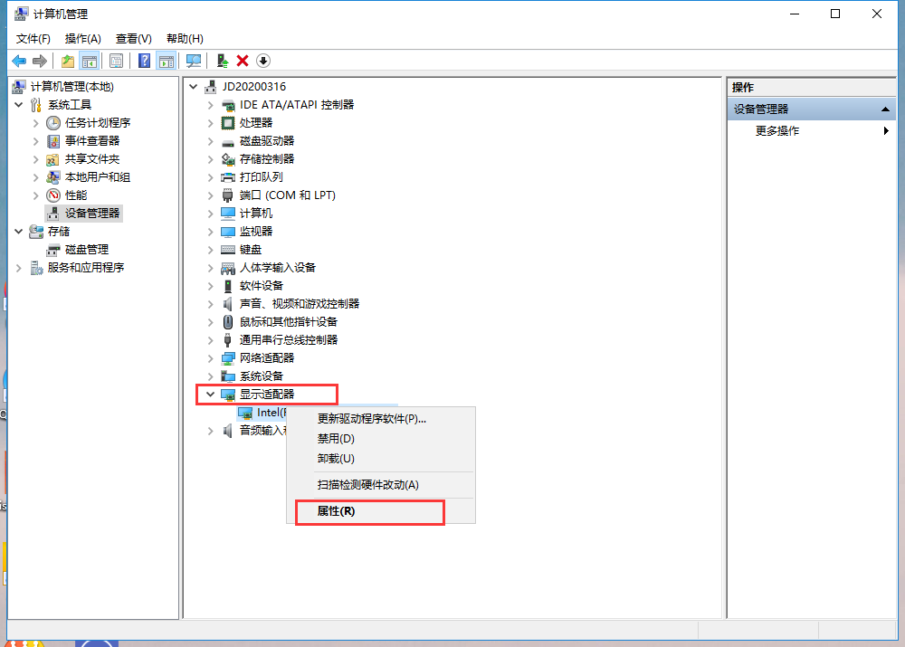 3、进入计算机管理窗口,如图,点击【设备管理器】,鼠标右击【显示适配器】,选择属性,