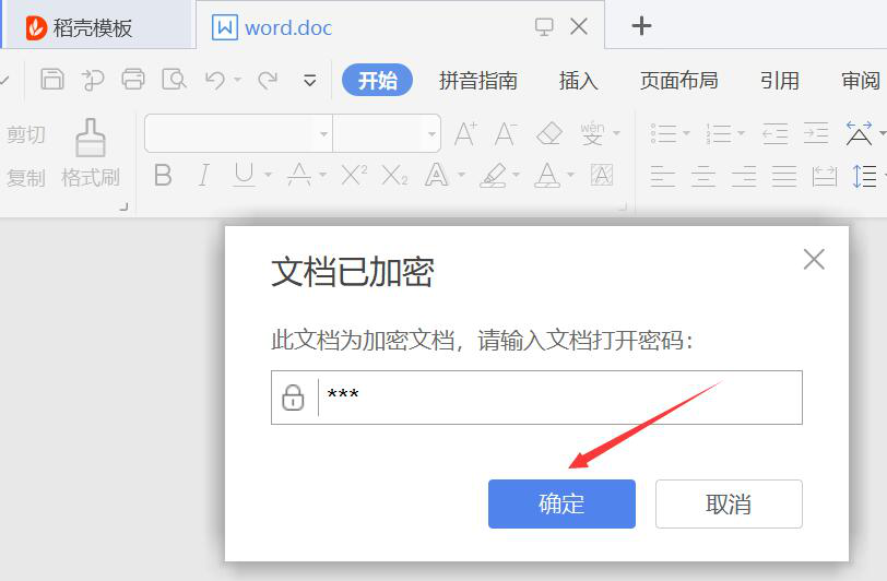 7、最后,当我们再次打开该word文档的时候,它便会自动弹出提示“文档已加密”,我们正确输入密码后,点击“确定”按钮,便可以正常浏览文档内容了。