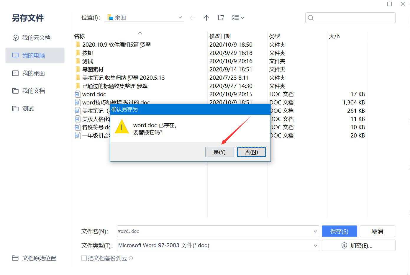 6、弹出“确定另存为”提示窗口,点击“是”按钮,确定将加了密码的这个word文档进行保存。