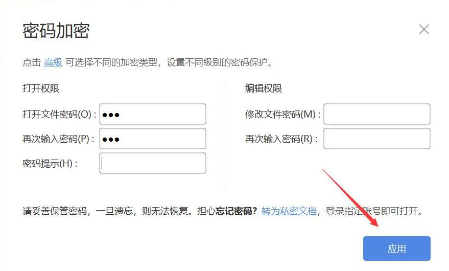 4、接下来,在“密码加密”的窗口中,设置“打开文件密码”和再次输入自己设置的密码,当然了,也可以设置一些密码提示,再点击“应用”按钮。