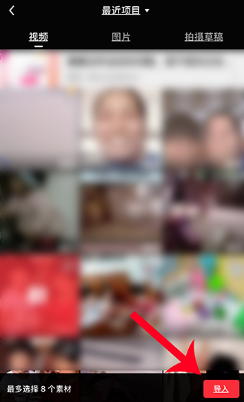 进入手机相册,选择视频素材,然后点击【导入】,注意,最多选择8个素材,