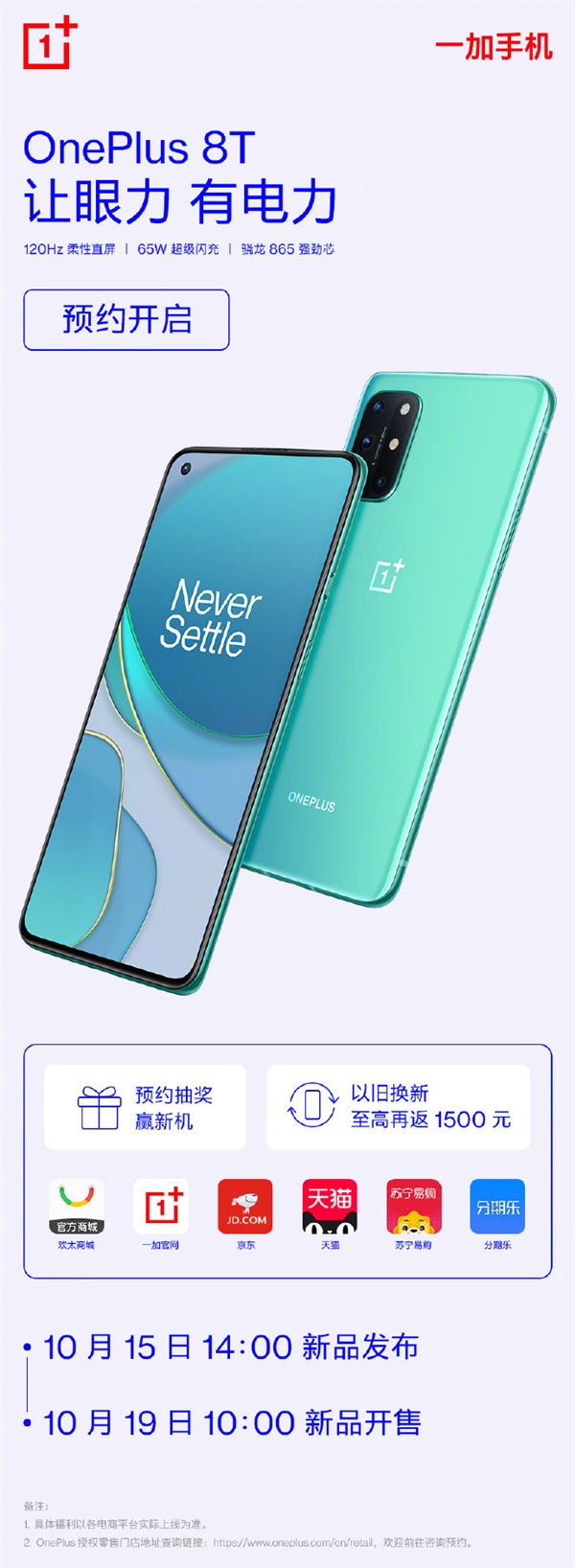 一加手机宣布,一加8T正式10月15日下午14:00发布开启预约,10月19日正式开售。