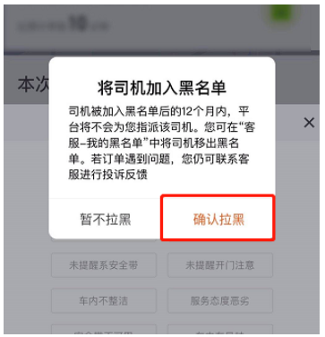 弹出窗口,点击【确认拉黑】即可,司机被加入黑名单后的12个月内,平台将不会为你指派该司机。