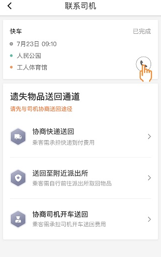 如果乘客将物品遗落在车上,在订单结束后的48小时内可根据自身需求联系司机,选择一种送回方式。其中,“协商司机开车送回”方式在每日8:00-22:00 开放,乘客需先与司机沟通,确定物品遗落在车上,协商一致,可反向发单。