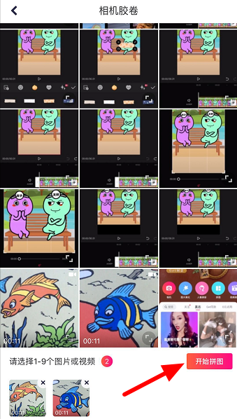 进入手机相册,如图,选择1-9个视频,这里选择两个视频,点击【开始拼图】,