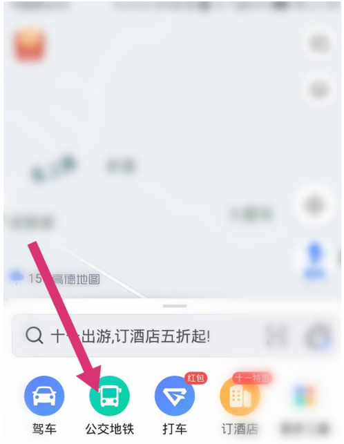 在手机中打开高德地图,登录账号,进入首页,如图,点击【公交地铁】,