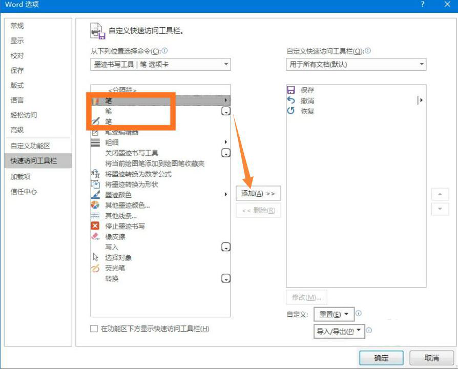 4、接下来,黄色框住的便是word画笔工具,如下图。我们依次将这三个word画笔工具单击选中,并点击窗口中部的“添加”按钮。