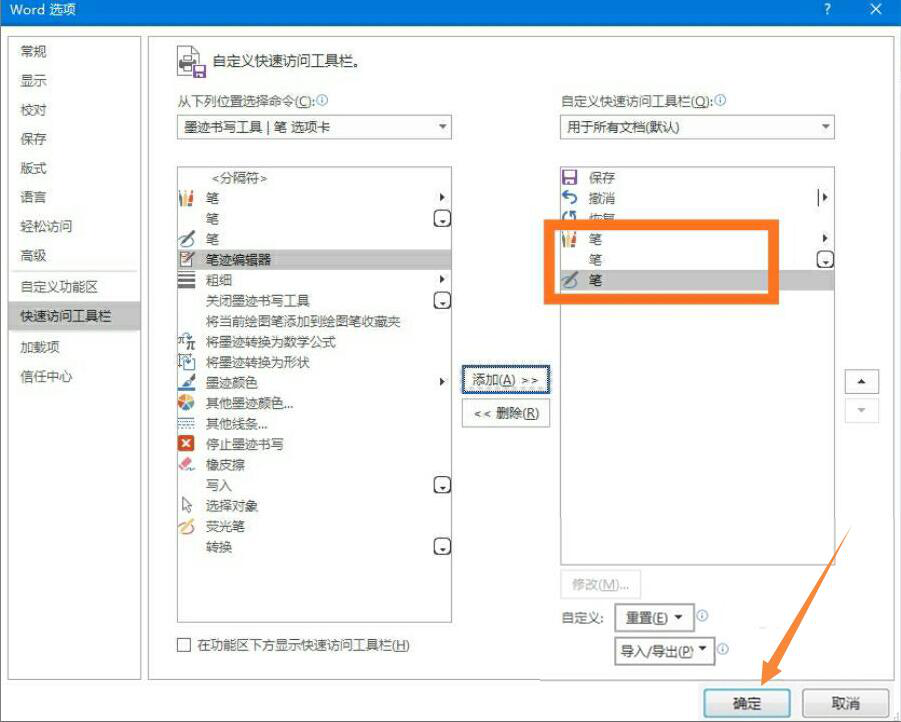 5、word画笔工具添加到右侧的自定义快速访问工具栏窗口后,我们点击右下方的“确定”按钮。