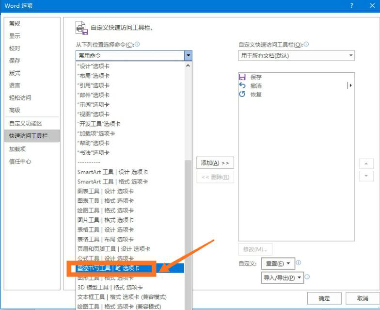 3、然后,进入word选项设置窗口。我们切换至“快速访问工具栏”选项卡,从常用命令中点击“墨迹书写工具|笔选项卡”。