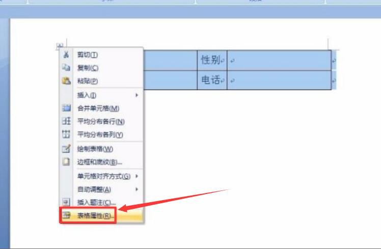 2、然后,将整个跨页断开的表格选中,并在右键菜单中点击“表格属性”。