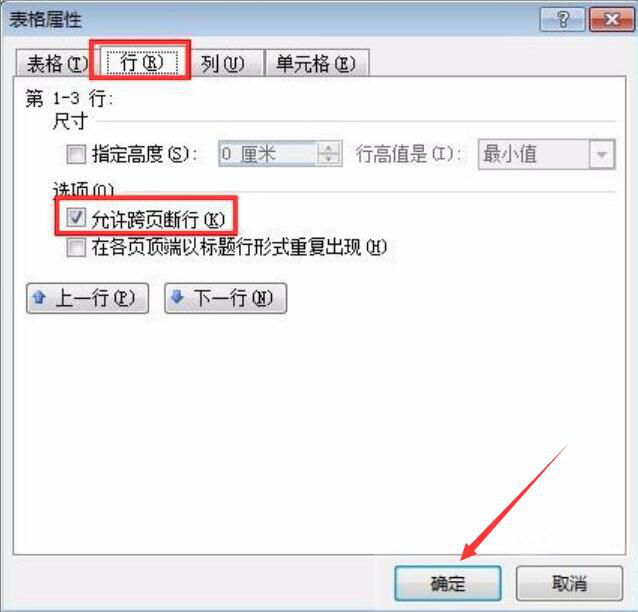 4、接下来,切换至“行”的表格属性,勾选“允许跨页断行”,再点击“确定”按钮。