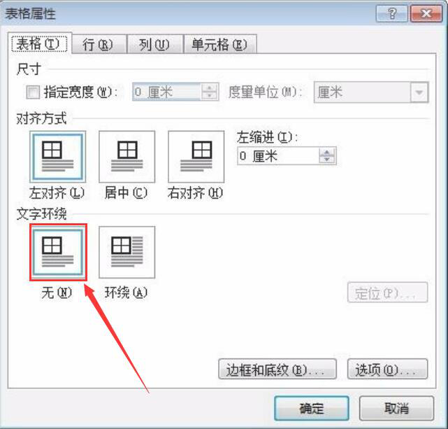 3、进入word表格属性窗口,先切换至“表格”选项卡,点选“无”的文字环绕方式。