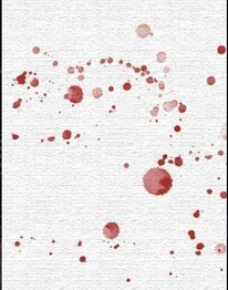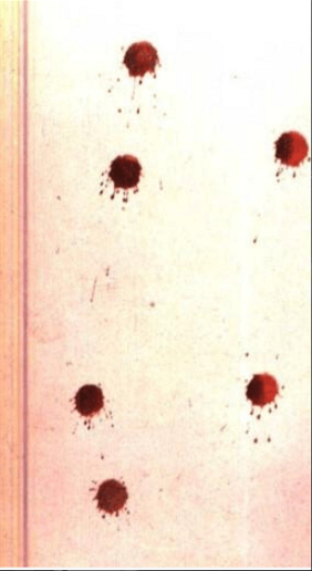 *滴落状血迹。血量多为0.05-0.5ml,形态与血液和载体接触时的角度直接相关。滴落的血迹可以反映出血液滴下的高度和行进方向。尸体所在的中心现场外,如果也发现了滴落状血迹,则可提示案犯也有损伤或者身上沾有血迹。如下图: