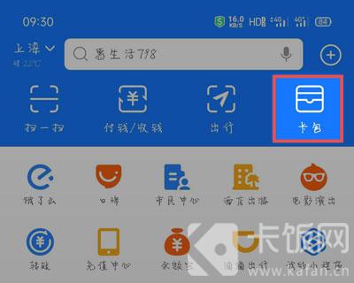 1、打开手机支付宝,登录已实名的支付宝账号,在首页点击右上方【卡包】;