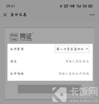 4、首先是身份证验证,选择自己的证件类型,输入身份证上的姓名、证件号码,点击【下一步】;