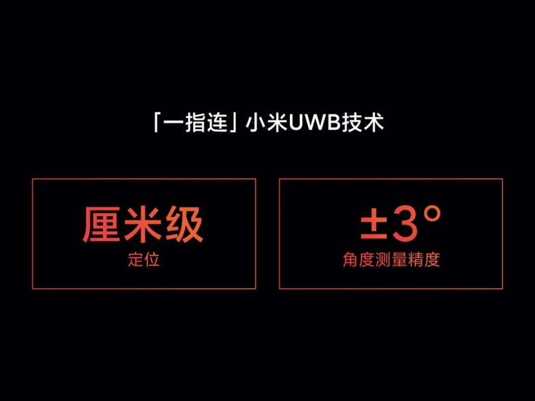 「一指连」小米 UWB 技术,是具备超精准定位的新一代连接技术,赋予手机与智能设备空间感知能力,手机指向设备即可定向操控。UWB 全称 Ultra Wide Band,也就是超宽带通信。支持小米 UWB 技术的手机可以实现对智能设备的厘米级定位,犹如人眼一般感知空间位置,指向任意智能设备都可直接控制,角度测量精度可达 ±3°,如同高精版「室内 GPS」。