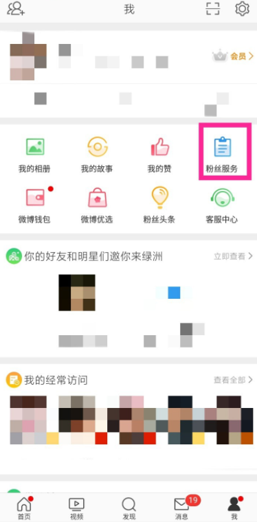 打开手机新浪微博,登录账号,进入首页,点击右下角的【我】,在个人中心点击【粉丝服务】,