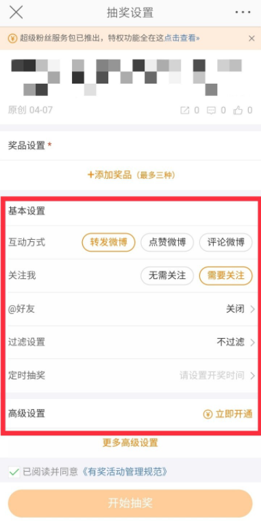 如图,根据提示操作,完成抽奖的基本设置,即可发布抽奖微博。