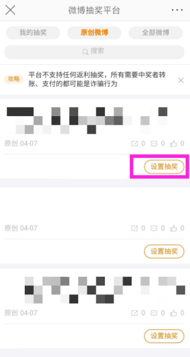 进入微博抽奖平台,如图,找到需要设定抽奖的微博,点击【设置抽奖】,