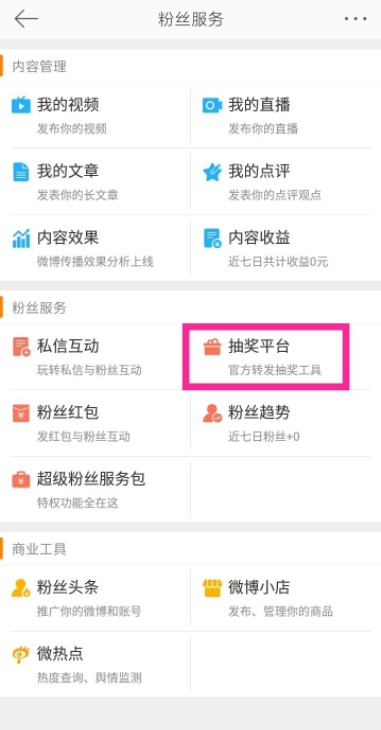 进入粉丝服务窗口,如图,点击【抽奖平台】,