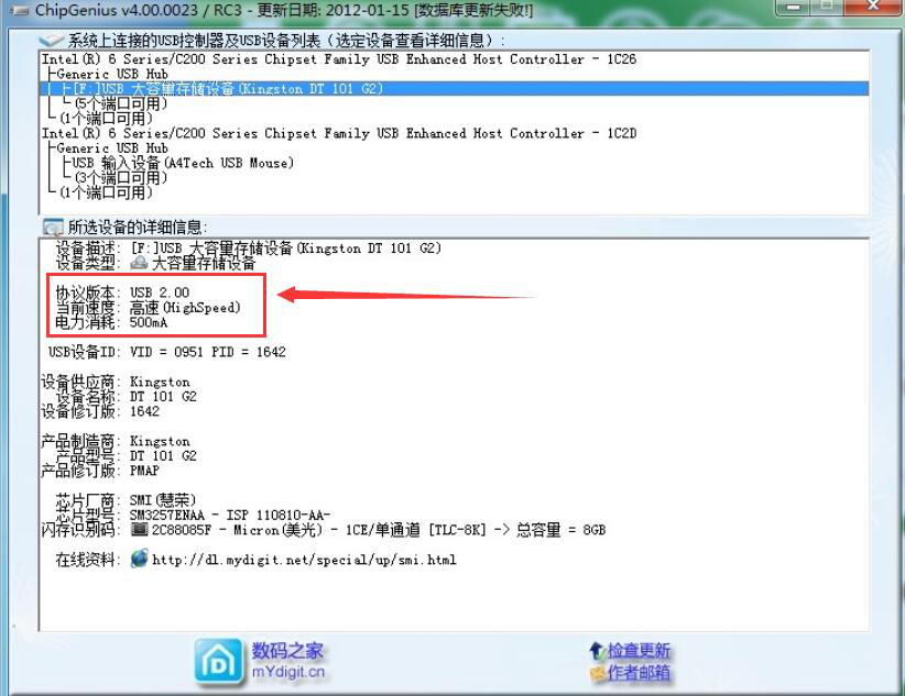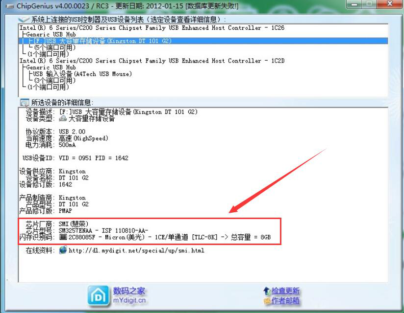 5、接下来,我们再看看ChipGenius检测的核心信息,那就是U盘的厂商、型号和内存。如下图,三者都能正常显示出来,便说明该U盘是正品。
